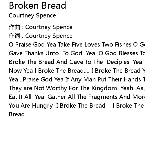 | O Praise God Yea Take Five Loves Two Fishes O God Jesus Look Up To Heaven And Gave Thanks Unto To God Yea O God Blesses To The Use To This Day Jesus Broke The Bread And Gave To The Deciples Yea To Place Before The Multitudes Now Yea I Broke The Bread.... I Broke The Bread Yea ... I Broke The Bread O God Yea .. Praise God Yea If Any Man Put Their Hands To The Plow Yea And Look Back They are Not Worthy For The Kingdom Yeah. Aa, Now Sit Down On The Grass And Eat It All Yea Gather All The Fragments And More Do You Follow Jesus Because You Are Hungry I Broke The Bread I Broke The Bread Yea ... I Broke The Bread ... |