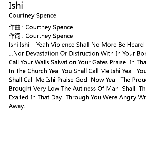 | Ishi Ishi Yeah Violence Shall No More Be Heard In Your Land Praise God Yea ... Nor Devastation Or Distruction With In Your Borders O God Yea... You Shall Call Your Walls Salvation Your Gates Praise In That Day This Song Shall Be Song In The Church Yea You Shall Call Me Ishi Yea You Shall Call Me Ishi Yea You Shall Call Me Ishi Praise God Now Yea The Proud Looks Of Man Shall Be Brought Very Low The Autiness Of Man Shall Then Be Humble O God Alone Will Be Exalted In That Day Through You Were Angry With Me Now Your Anger Has Turn Away. |