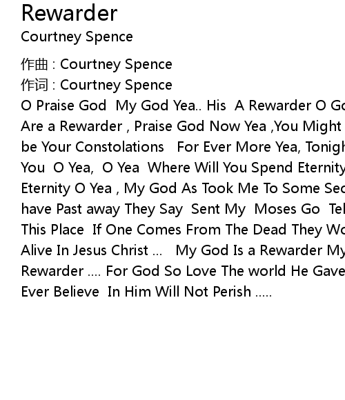 | O Praise God My God Yea.. His A Rewarder O God Now Yea You Are a Rewarder You Are a Rewarder , Praise God Now Yea ,You Might Be Rich I Might Be Poor That will be Your Constolations For Ever More Yea, Tonight Your Souls Is Required Of You O Yea, O Yea Where Will You Spend Eternity Yeah Where Will You Spend Eternity O Yea , My God As Took Me To Some Secret Places I Hear The People who have Past away They Say Sent My Moses Go Tell My Brethren Don't Come To This Place If One Comes From The Dead They Wont Believe Much Less One Who Is Alive In Jesus Christ ... My God Is a Rewarder My God Is A Rewarder God Is Rewarder .... For God So Love The world He Gave His Only Begotten Son Who So Ever Believe In Him Will Not Perish ..... |