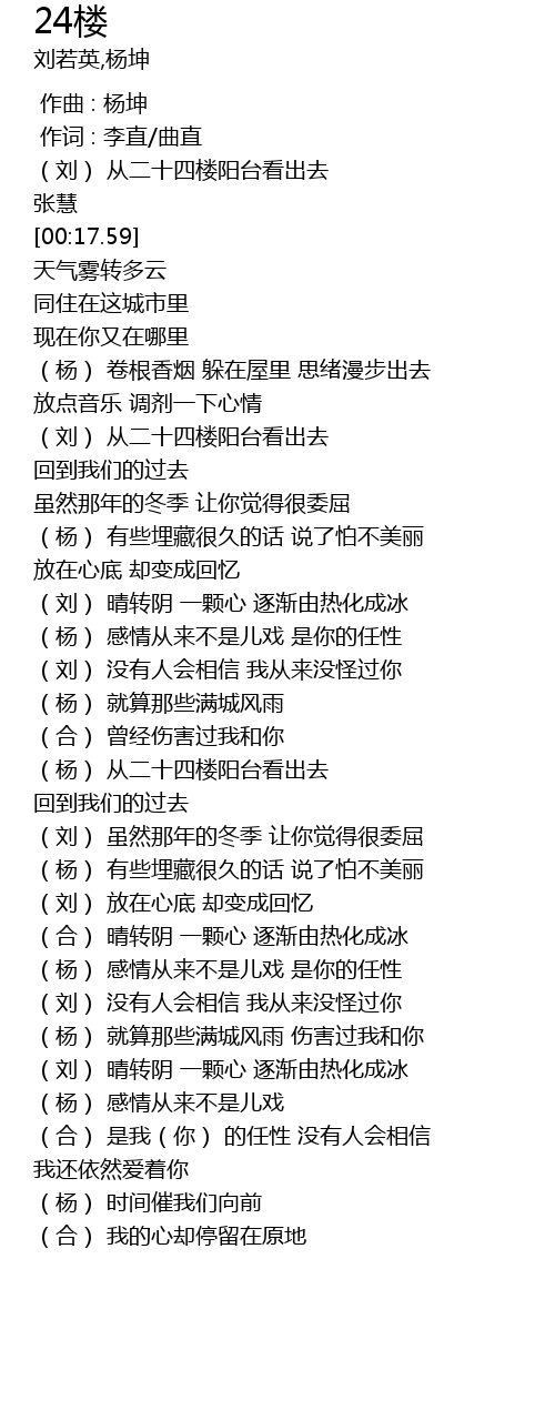 | [00:15.60] | liu cong er shi si lou yang tai kan chu qu |