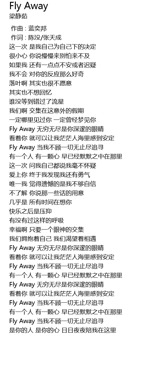 | [02:53.410] | Fly Away dāng wǒ bù gù yī qiè wú zhǐ jǐn zhuī xún |