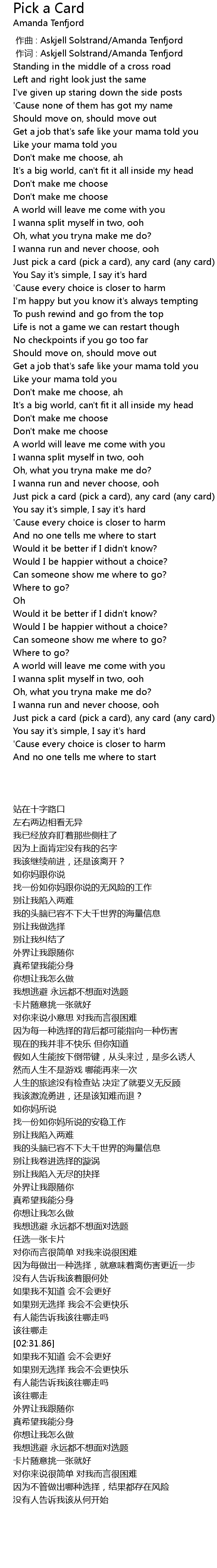 | [02:21.91] | Would I be happier without a choice? |