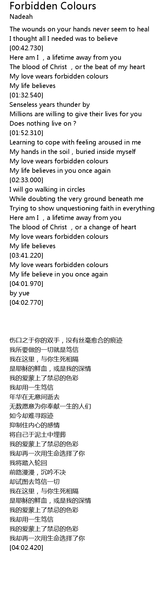 | [02:11.840] | My love wears forbidden colours |
