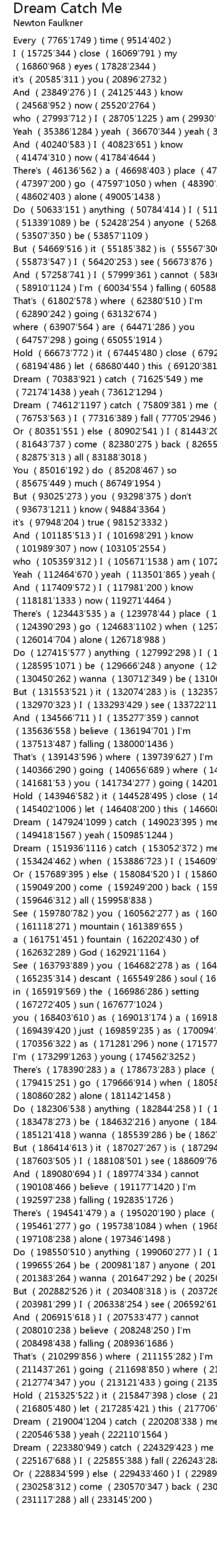| [15725'4453] | I 15725' 344 close 16069' 791 my 16860' 968 eyes 17828' 2344 |