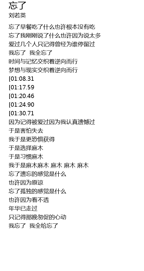 | [03:08.31][01:24.90] | 忘了当初的坚持是什么 |