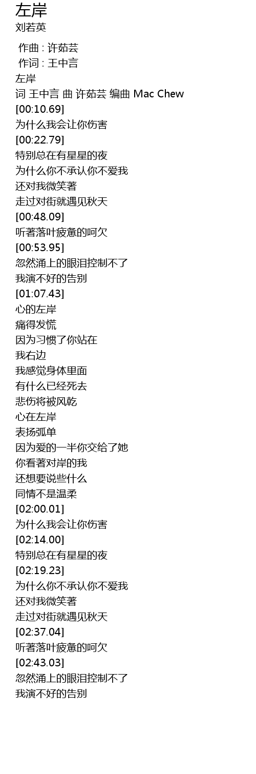 | [00:06.31] | 词 王中言 曲 许茹芸 编曲 Mac Chew |