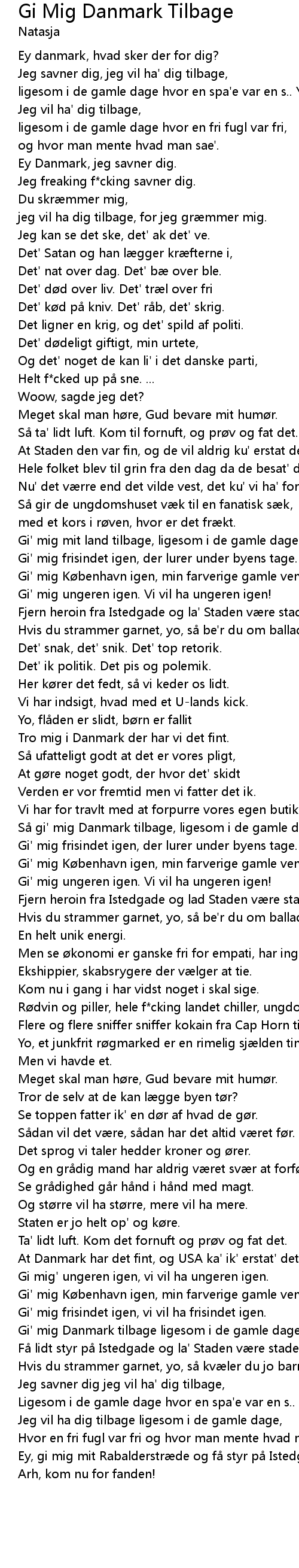 | Så gi' mig Danmark tilbage, ligesom i de gamle dage. | |