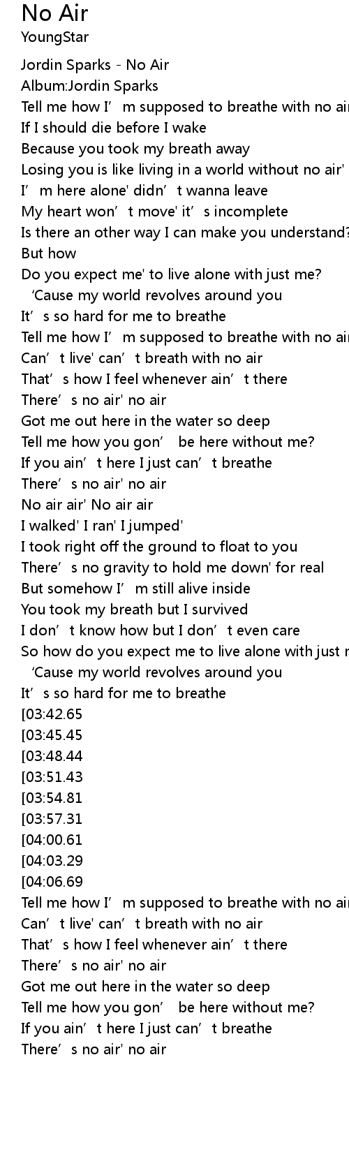 | [02:09.60][03:45.45] | Can' t live' can' t breath with no air |