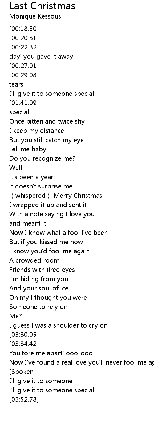 | [00:00.90][00:18.50][01:28.09][01:45.54][02:55.45][03:12.86] | Last Christmas |