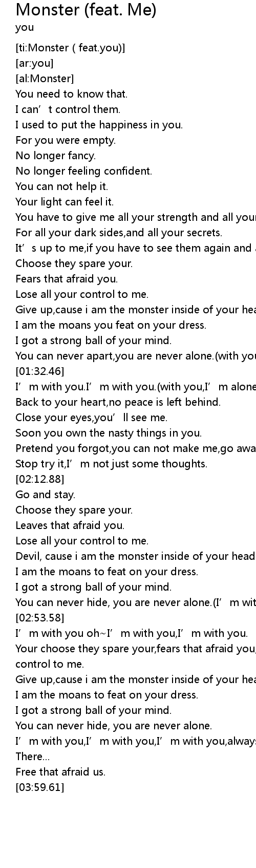 | [03:13.92] | Give up, cause i am the monster inside of your head. inside your head |