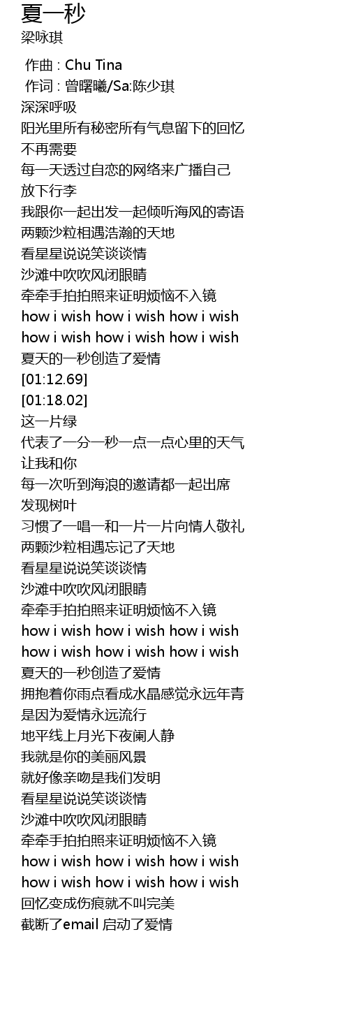 | [00:01.00] | 作词 : 曾曙曦/Sa:陈少琪 |