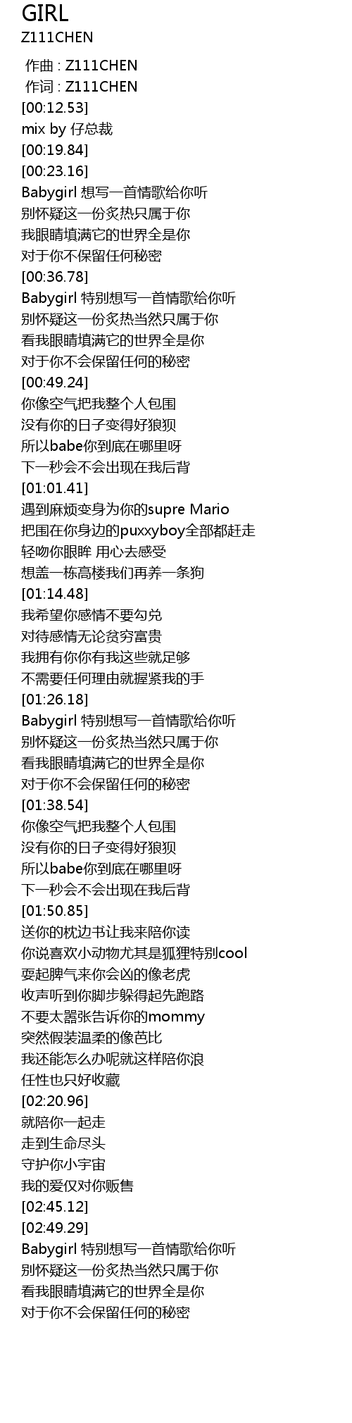 | [00:25.34] | Babygirl 想写一首情歌给你听 |