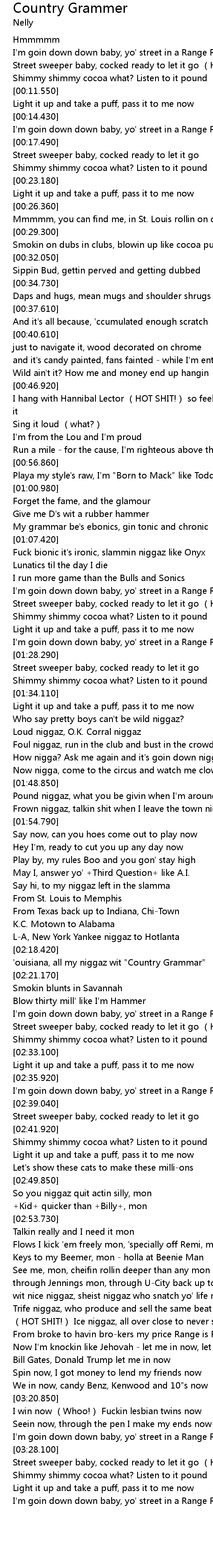 | [02:18.920] | ' ouisiana, all my niggaz wit " Country Grammar" |