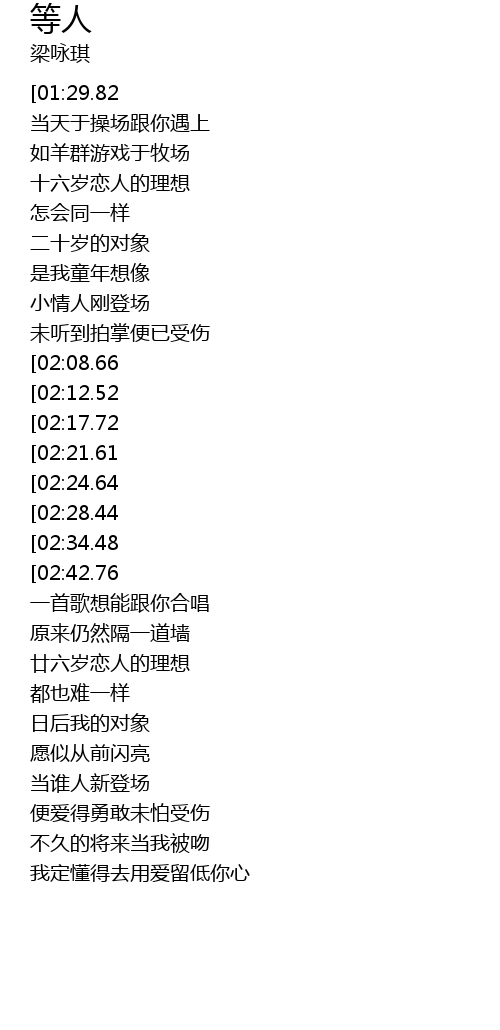 | [00:13.00][01:29.82][02:46.89][03:44.05] | 梁咏琪-等人(粤) |