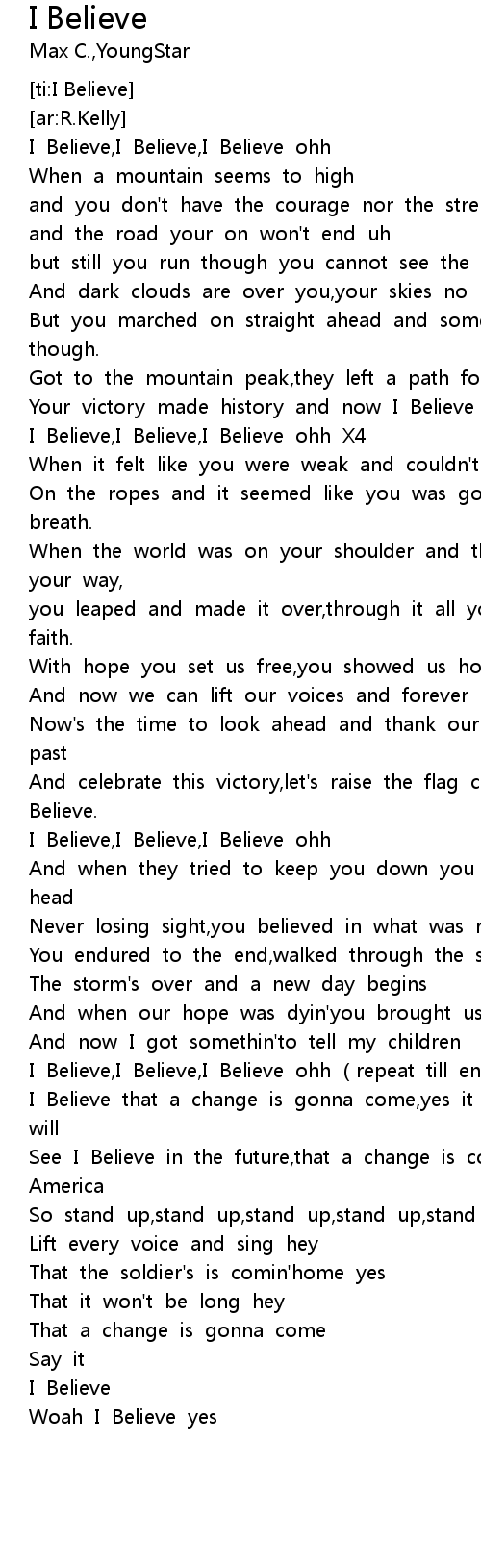 | [03:11.483] | I Believe, I Believe, I Believe ohh repeat till end |