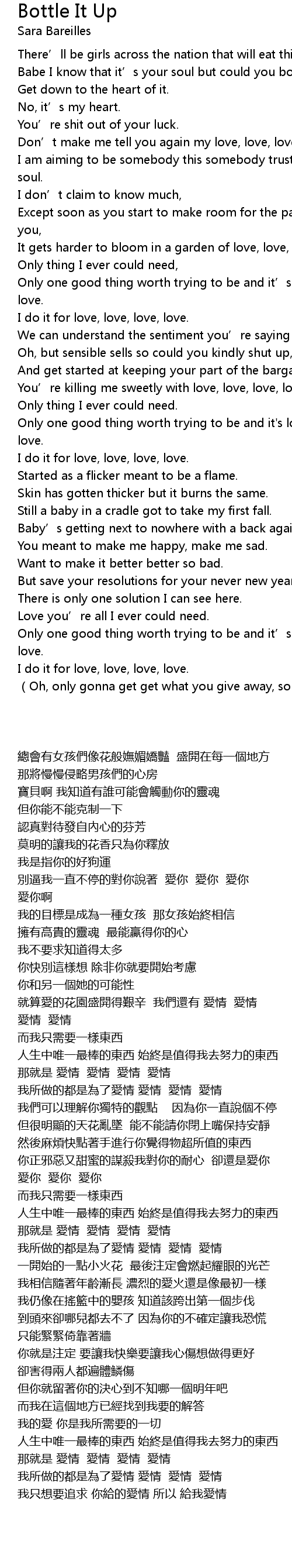 | [00:21.310] | Babe I know that it’s your soul but could you bottle it up. |
