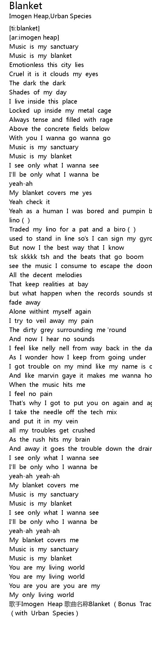 | [04:28.340] | gē shǒu Imogen Heap gē qǔ míng chēng Blanket Bonus Track |