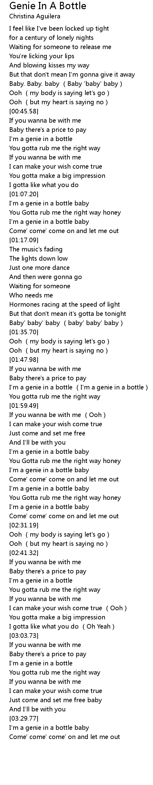| [03:30.43] | I'm a genie in a bottle baby |