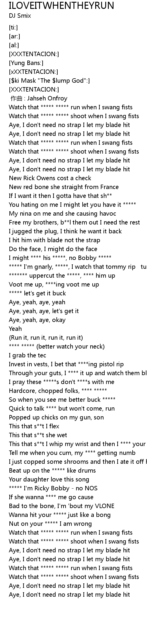| [03:18.89] | Watch that ***** ***** run when I swang fists |