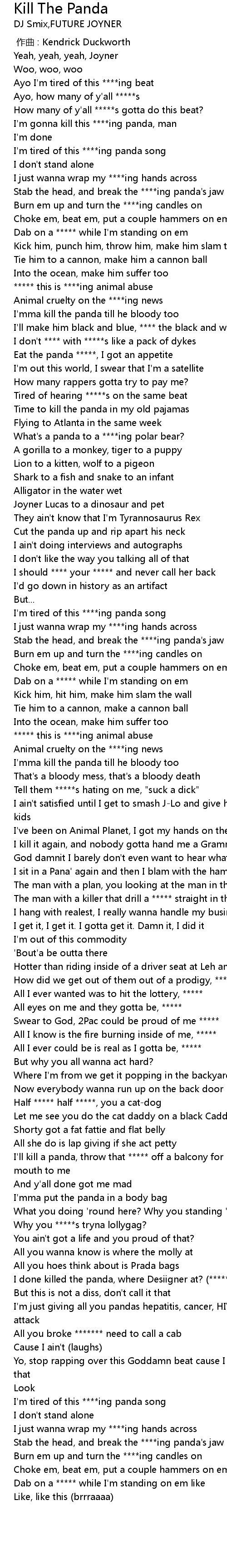 | [00:21.695] | Stab the head, and break the ing panda' s jaw |