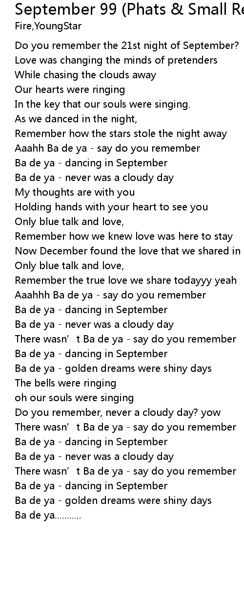 | [02:55.86] | Ba de ya dancing in September |