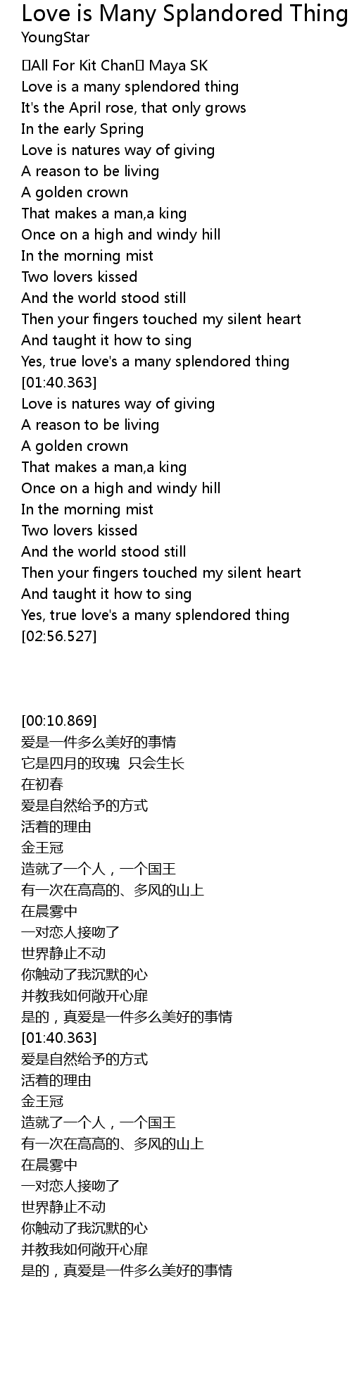 | [00:21.837] | Love is a many splendored thing |