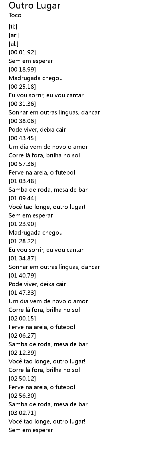 | [02:12.64] | Voc tao longe, outro lugar! |