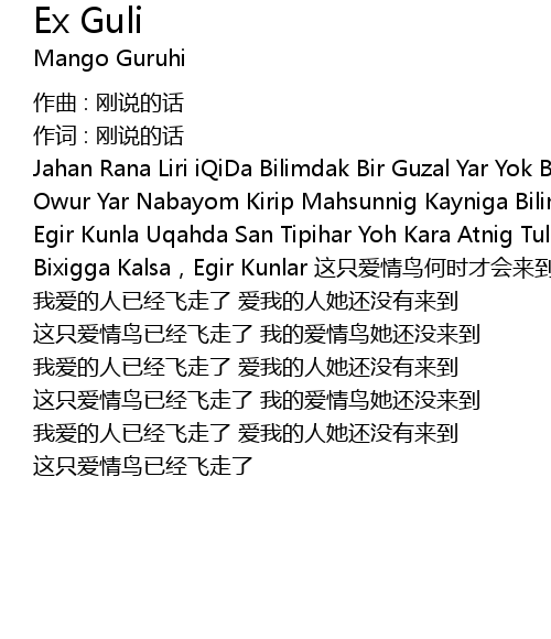 | Jahan Rana Liri iQiDa Bilimdak Bir Guzal Yar Yok Bilimdin Ozga Tutkan Yar Bolur Owur Yar Nabayom Kirip Mahsunnig Kayniga Bilimdin Ozga Yar Tutma Bexigga Kalsa Egir Kunla Uqahda San Tipihar Yoh Kara Atnig Tulun Ayla Maga Brdak Tulun Ayla Bixigga Kalsa,Egir Kunlar 这只爱情鸟何时才会来到 我爱的人已经飞走了 爱我的人她还没有来到 这只爱情鸟已经飞走了 我的爱情鸟她还没来到 我爱的人已经飞走了 爱我的人她还没有来到 这只爱情鸟已经飞走了 我的爱情鸟她还没来到 我爱的人已经飞走了 爱我的人她还没有来到 这只爱情鸟已经飞走了 |