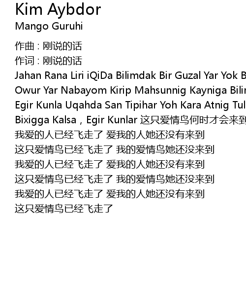| Jahan Rana Liri iQiDa Bilimdak Bir Guzal Yar Yok Bilimdin Ozga Tutkan Yar Bolur Owur Yar Nabayom Kirip Mahsunnig Kayniga Bilimdin Ozga Yar Tutma Bexigga Kalsa Egir Kunla Uqahda San Tipihar Yoh Kara Atnig Tulun Ayla Maga Brdak Tulun Ayla Bixigga Kalsa,Egir Kunlar 这只爱情鸟何时才会来到 我爱的人已经飞走了 爱我的人她还没有来到 这只爱情鸟已经飞走了 我的爱情鸟她还没来到 我爱的人已经飞走了 爱我的人她还没有来到 这只爱情鸟已经飞走了 我的爱情鸟她还没来到 我爱的人已经飞走了 爱我的人她还没有来到 这只爱情鸟已经飞走了 |