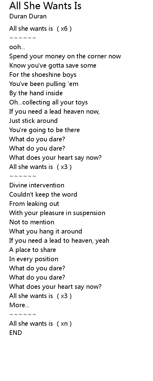 | [01:20.41] | All she wants is (x3) |