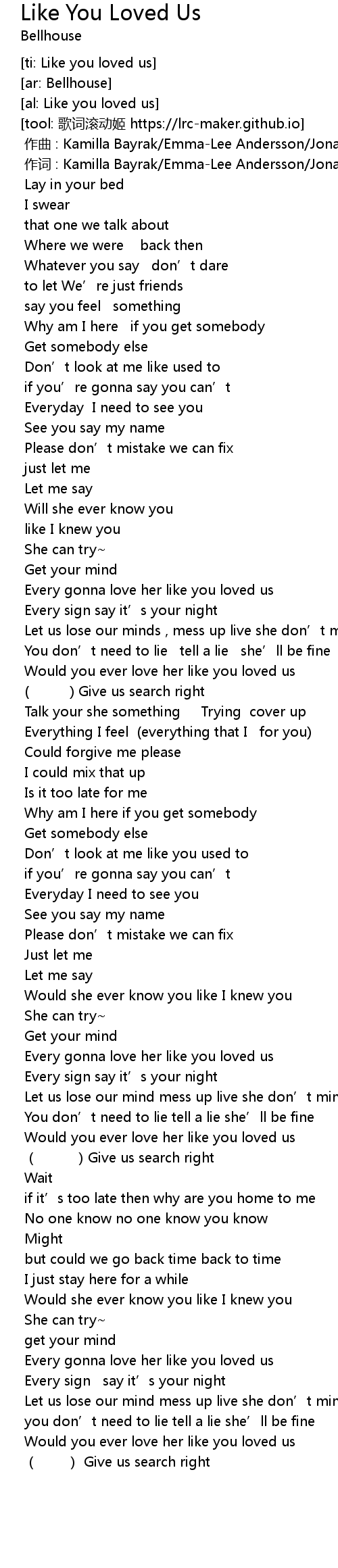 | [00:00.650] | 作词 : Kamilla Bayrak/Emma-Lee Andersson/Jonathan Bellini |