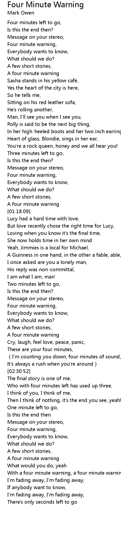 | [00:23.18] | Four minute warning, |