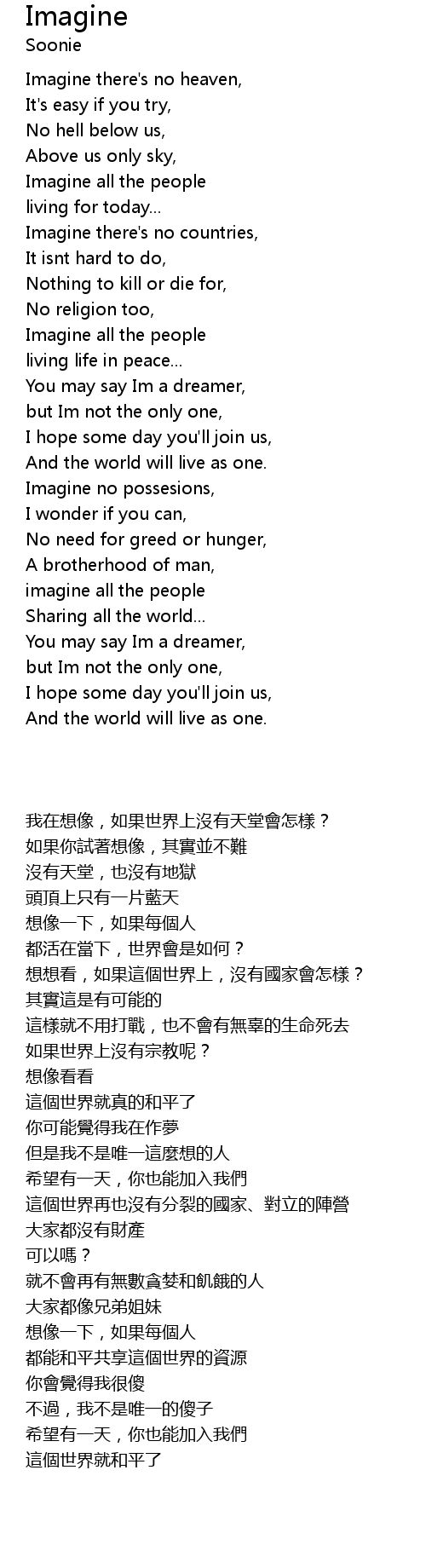 | [00:15.0] | Imagine there' s no heaven, |