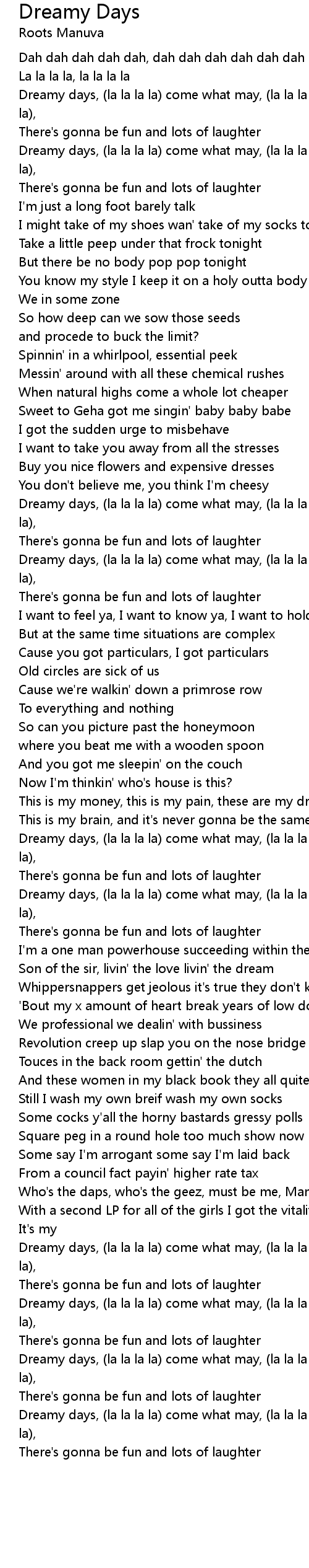 Dreamy days, (la la la la) come what may, (la la la la) we feel no way (la la la la), |