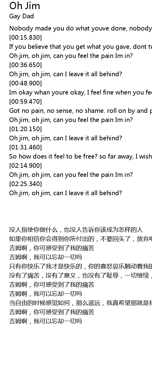 | [02:16.340] | Oh jim, oh jim, can you feel the pain Im in? |