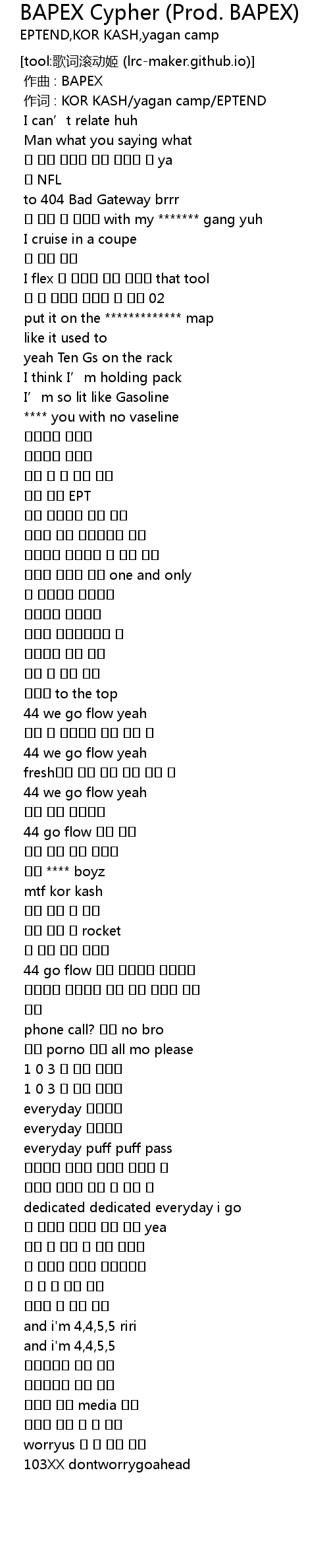 | [00:01.000] | 作词 : KOR KASH/yagan camp/EPTEND |