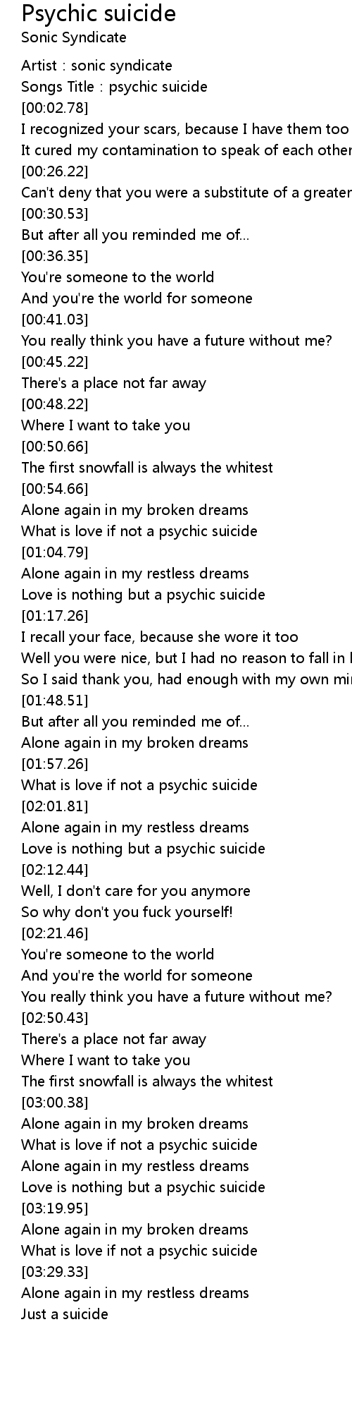 | [00:01.47] | Songs Title: psychic suicide |