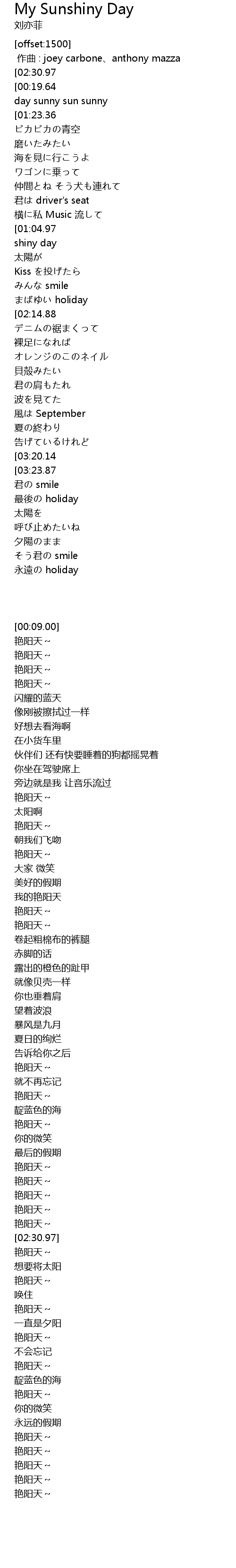 | [00:15.75][00:19.64][00:23.41][01:19.80][02:16.11][02:19.62][02:23.41][03:36.40][03:40.22][03:43.99] | Sunshiny day sunny sun sunny |