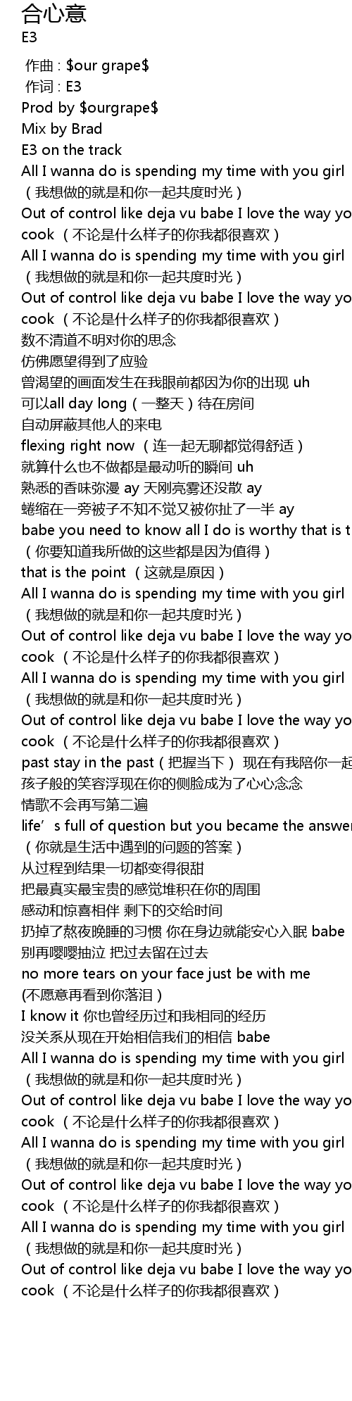 | [01:34.13] | Out of control like deja vu babe I love the way you move the way you cook bù lùn shì shén me yàng zi de nǐ wǒ dōu hěn xǐ huān |