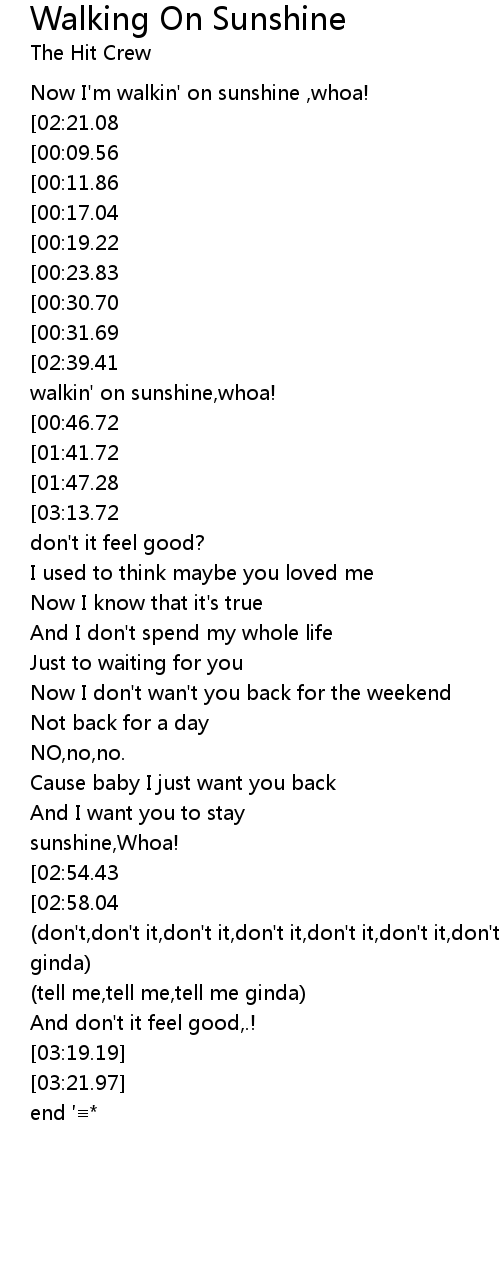 | [00:02.10] | Now I' m walkin' on sunshine , whoa! |