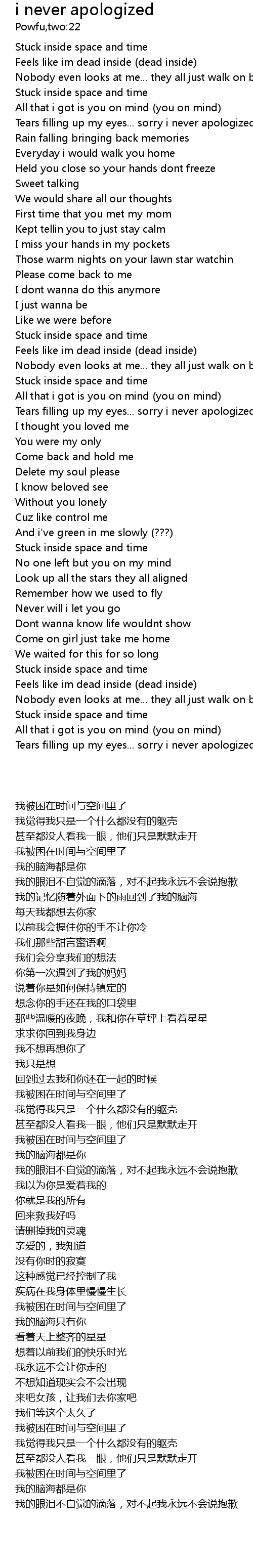 | [02:19.24] | Tears filling up my eyes... sorry i never apologized(x2) |