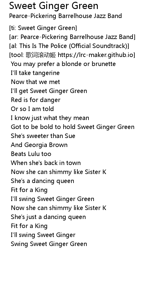 | [01:10.058] | Got to be bold to hold Sweet Ginger Green |