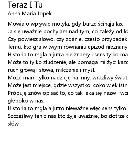 | Historia to mgła a jutra nie znamy i sens tylko ma dziś, teraz i tu. | |