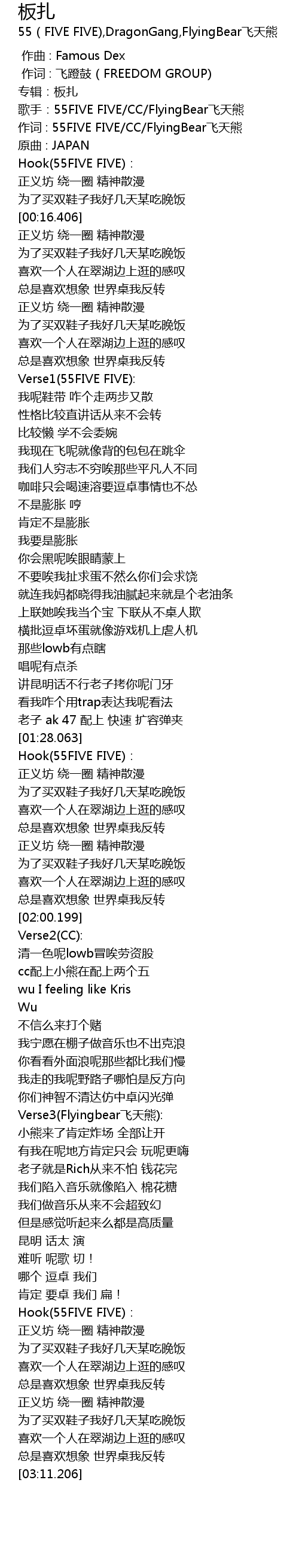 | [00:02.567] | 歌手:55FIVE FIVE/CC/FlyingBear飞天熊 |