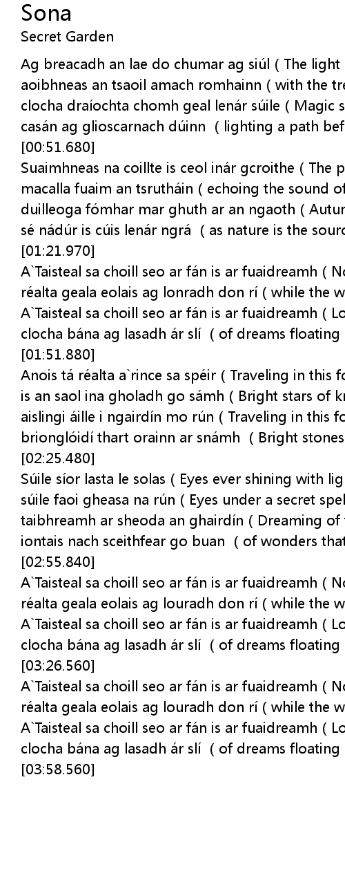 | [03:43.150] | A Taisteal sa choill seo ar fa n is ar fuaidreamh Lovely visions in the secret garden, |