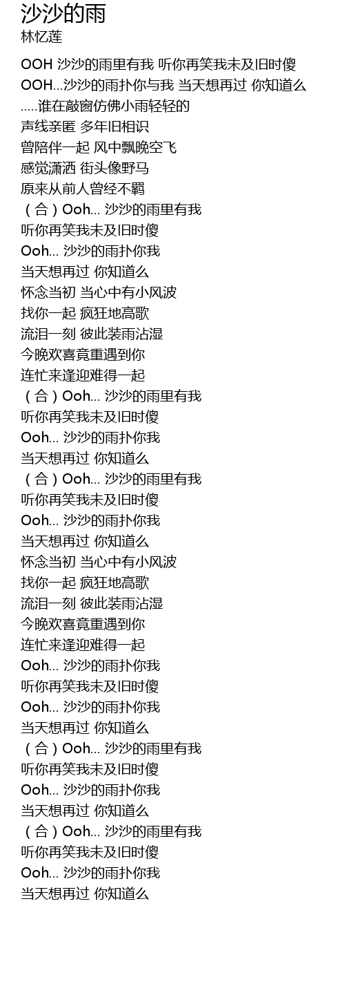 | [00:01.69] | OOH 沙沙的雨里有我 听你再笑我未及旧时傻 OOH...沙沙的雨扑你与我 当天想再过 你知道么 .....谁在敲窗仿佛小雨轻轻的 |