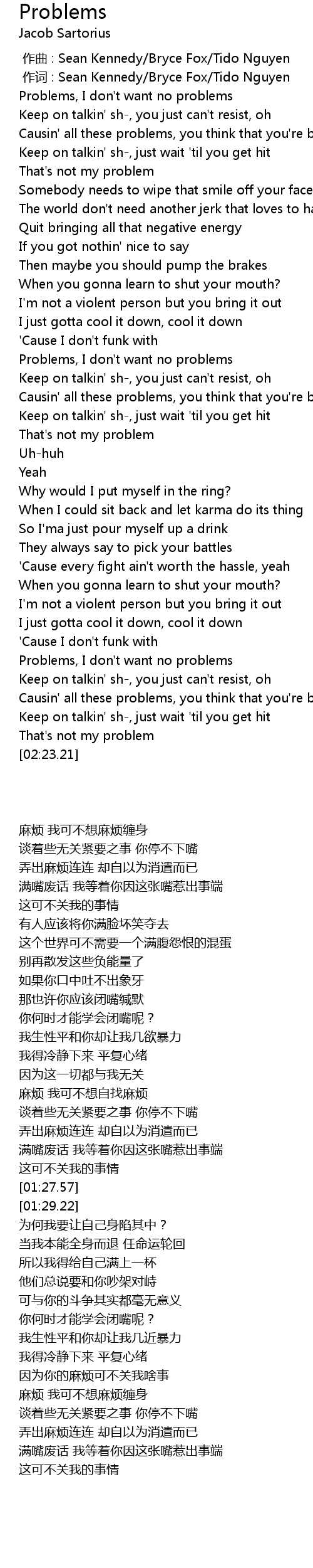 | [02:01.74] | Problems, I don' t want no problems |