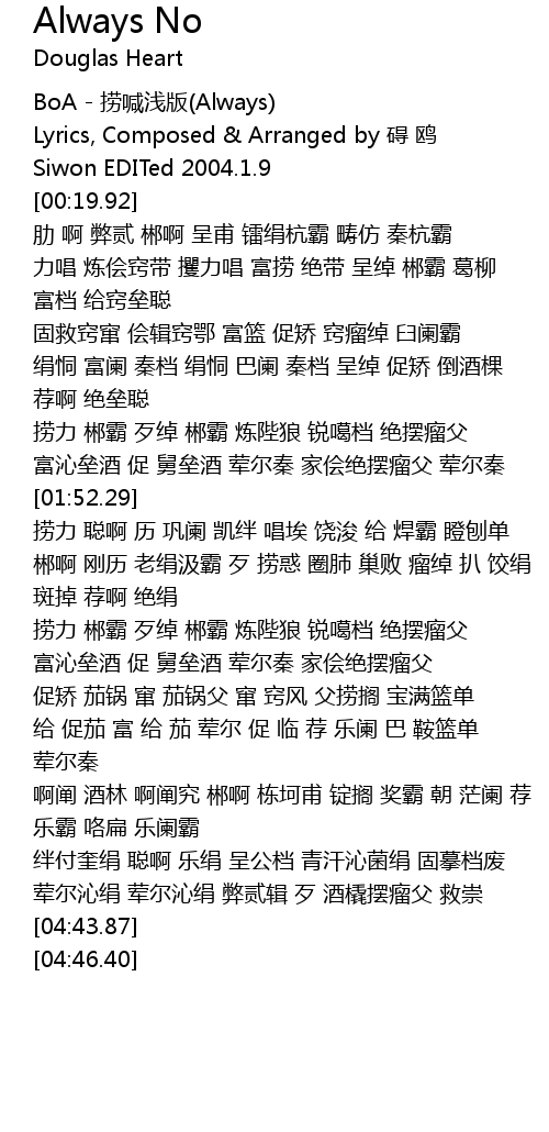 | [00:00.88] | BoA - 捞喊浅版(Always) |