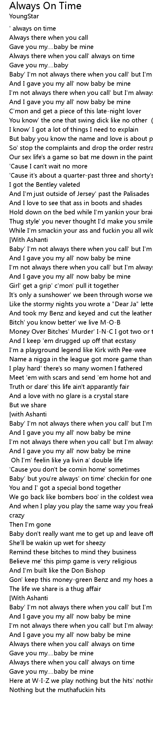 | [00:19.99] | Baby' I'm not always there when you call' but I'm always on time |