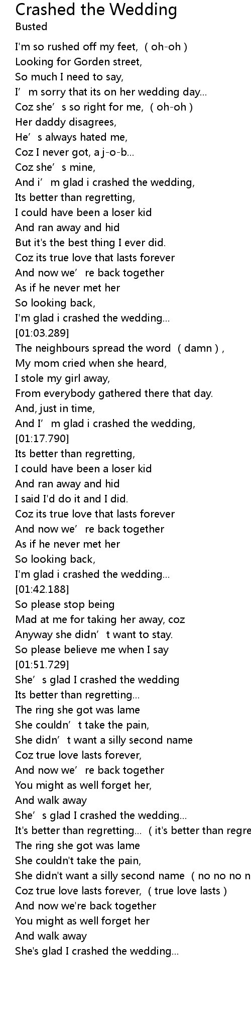 | [02:15.296] | She' s glad I crashed the wedding... |